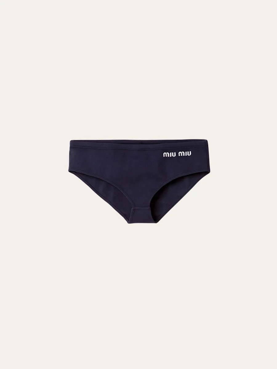 Miu Miu interlock knit bikini bottoms with an embroidered logo Low waist Classic fit Moderate seat coverage Stepin style Nylon/polyamide/nylon/polyamide/elastane Made in Italy