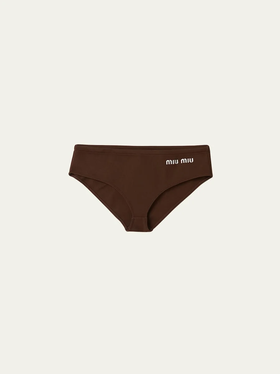 Miu Miu interlock knit bikini bottoms with an embroidered logo Low waist Classic fit Moderate seat coverage Stepin style Nylon/polyamide/nylon/polyamide/elastane Made in Italy