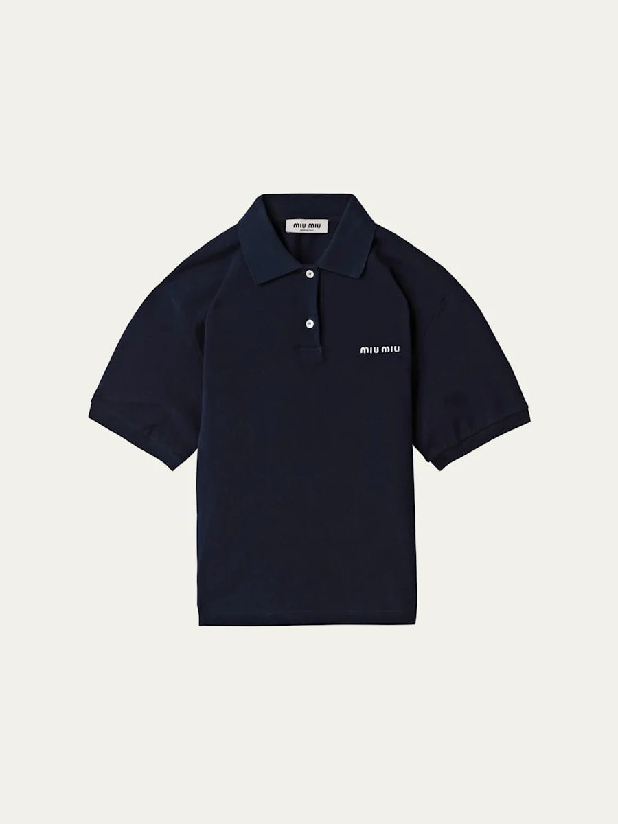 Miu Miu pique polo shirt with embroidered logo on the chest Spread collar; twobutton placket Short sleeves Boxy fit Side slits Pullover style Cotton/shell Unlined Made in Italy