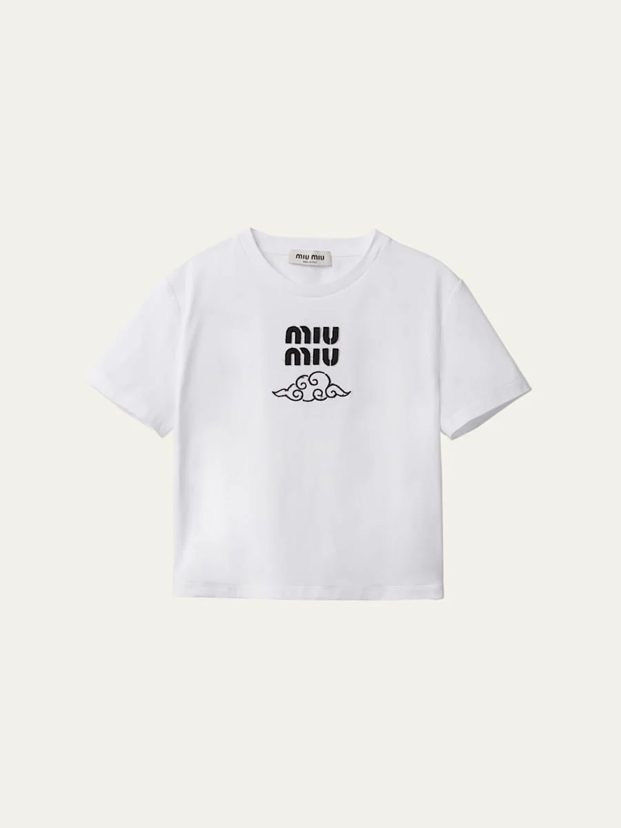 Miu Miu jersey Tshirt features logo and cloud embroidery Crew neckline Short sleeves Straight fit Pullover style Cotton Made in Italy