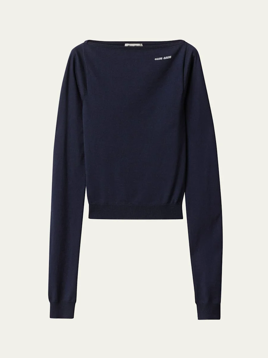 Miu Miu sweater featuring logo shoulder intarsia Boat neckline Long sleeves Relaxed fit Ribbed cuffs and hem Pullover style Wool Made in Italy