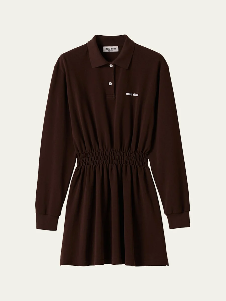 Miu Miu polo shirtdress is crafted from a lightweight cotton knit cinched at the waist with elasticized smocking Point collar; threebutton front Long sleeves; ribbed cuffs Logo chest intarsia Aline silhouette Slipover style Cotton Made in Italy
