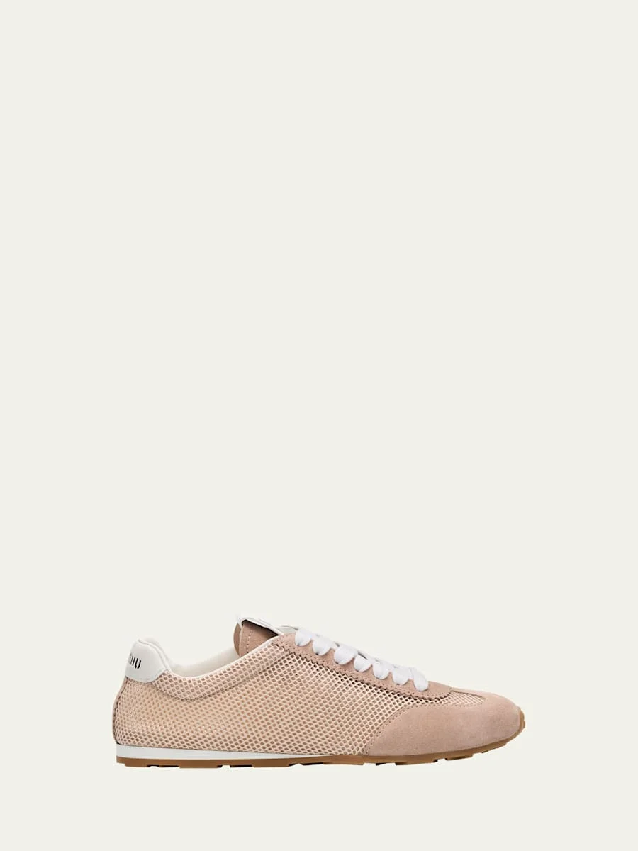 Miu Miu sneakers in mesh suede and leather 0.17 in / 5 mm flat heel Reinforced round toe Lace-up vamp Logo on heel-tab Slip-on style Rubber outsole Lining: Leather Made in Italy Online Inquiries: BGS21_X6SKQ| Store Inquiries: #4939046
