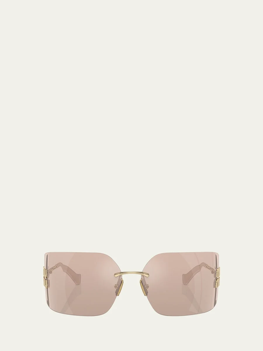 Miu Miu "MU 54YS" dynamic wraparound sunglasses in metal and plastic Eye/bridge/temple (in mm): 80-14-110 Rimless lenses Adjustable nose pads Vertical logo at temples Capped earpieces 100% UVA/UVB protection Made in Italy Proposition 65 warning for California residents Online Inquiries: BGS21_D4X32| Store Inquiries: #4788836