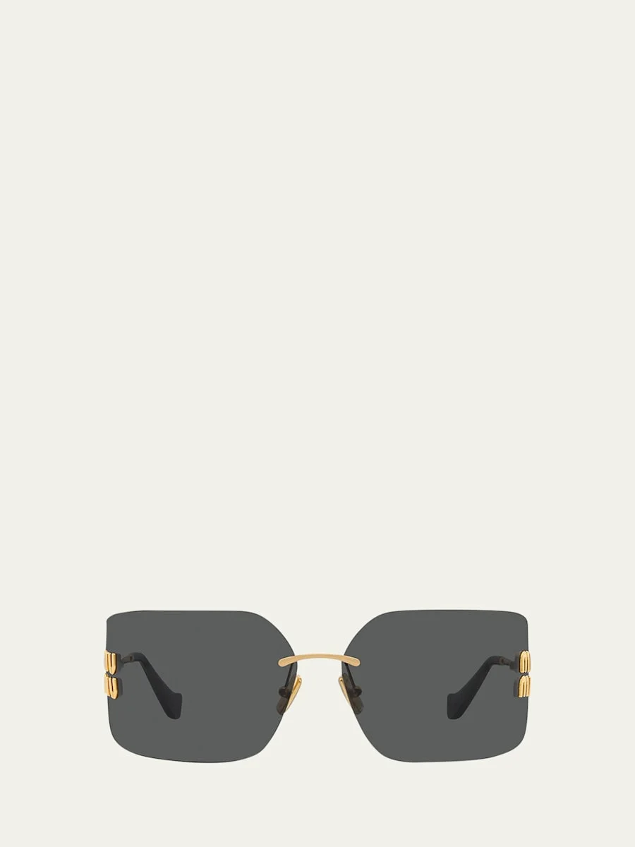 Miu Miu "Mu 54YS 80" rimless wrap sunglasses in titanium Lens/bridge/temple (in mm): 80-14-110 Solid lenses Adjustable nose pads Raised logo accent on temples Thin, tapered arms Capped earpieces 100% UVA/UVB protection Made in Italy Proposition 65 warning for California residents Online Inquiries: BGS21_D4NXD| Store Inquiries: #4578773