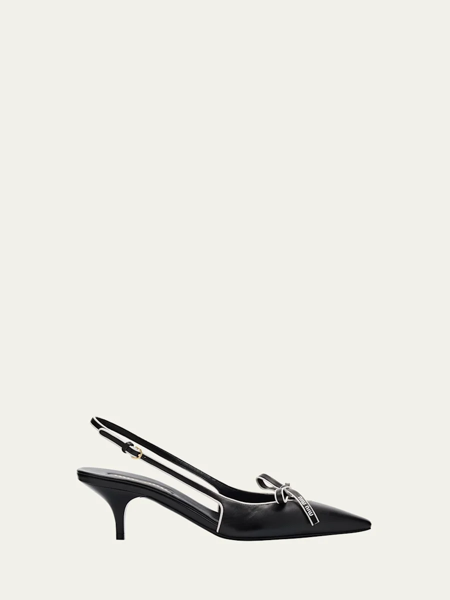 Miu Miu nappa leather slingback pumps with contrast piping and a bow accent with logo print 2.25 in / 55 mm comma heel Pointed toe Adjustable slingback strap Easy slide style Leather outsole Lining: Unlined Professional cleaning recommended, wipe clean Made in Italy