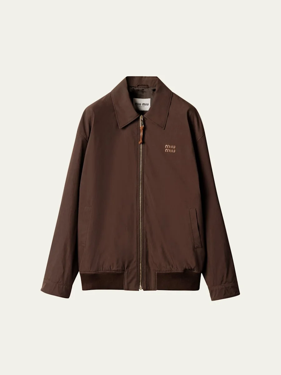 Miu Miu jacket in Panama cotton with a calf leather lettering logo, zipper pull and cuffs Shirt collar; front zip closure Long sleeves; button cuffs Welt pockets Relaxed fit Hip length Ribbed hem Cotton/polyester/leather Made in Italy Online Inquiries: BGS21_BA77K| Store Inquiries: #5044959