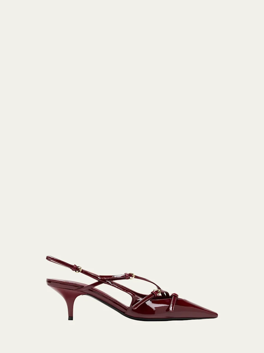 Miu Miu modern pumps in patent leather 2.25 in / 55 mm kitten heel Pointed toe Three buckle strap upper Adjustable slingback strap Leather outsole Made in Italy Online Inquiries: BGS21_X6L42| Store Inquiries: #4601841