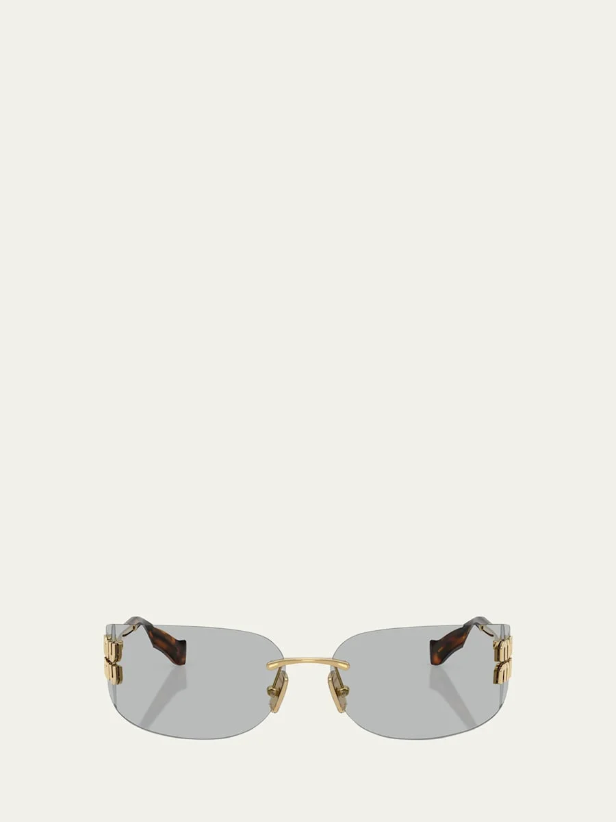Miu Miu rimless rectangle sunglasses in metal Solid lenses Adjustable nose pads Logo on temples Thin, tapered arms Capped earpieces 100% UVA/UVB protection Made in Italy Proposition 65 warning for California residents Online Inquiries: BGS21_D533L| Store Inquiries: #4924459