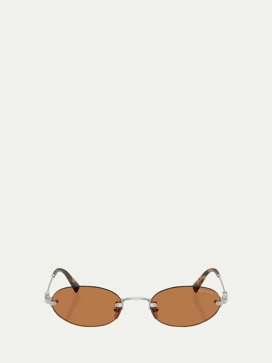 Miu Miu "MU A54S" sunglasses feature a sleek oval shape in a silver-tone frame. With their versatile design, these sunglasses easily complement any outfit. Eye/bridge/temple (in mm): 51-20-140mm Monochromatic lenses Adjustable nose pads Silver-tone logo on temples Thin, tapered arms Capped earpieces 100% UVA/UVB protection Metal Spot clean Made in Italy Proposition 65 warning for California residents Online Inquiries: BGS21_D5B77| Store Inquiries: #5057689