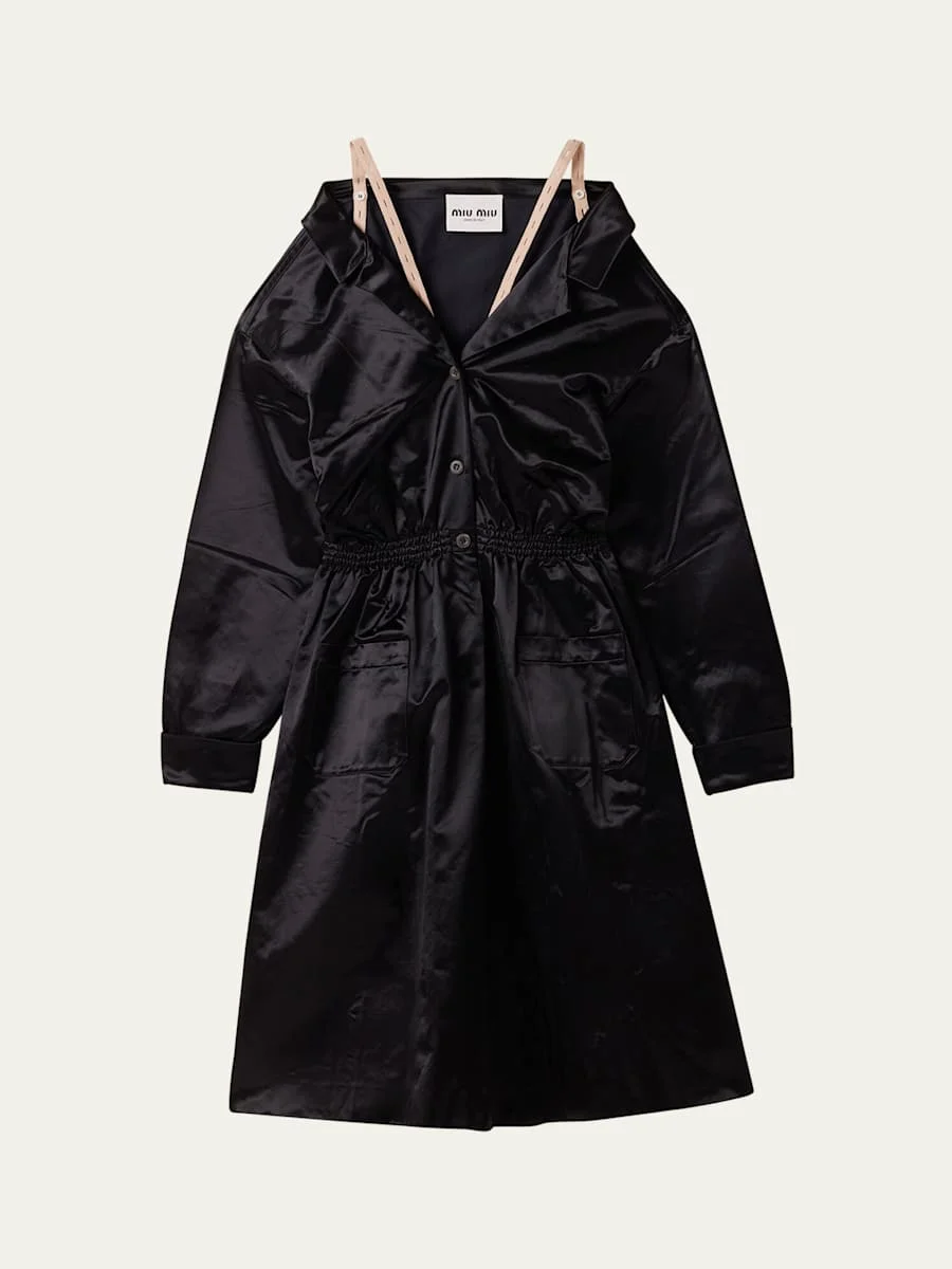 Enriched by a lustrous satin composition, this shirtdress by Miu Miu features contrasting thin shoulder straps and a figure-defining elastic waistband Wide collared neckline Long sleeves; shirt cuffs Hip patch pockets Hem hits around the knee Straight fit Front button closure Cotton/viscose Made in Italy Online Inquiries: BGS21_BAC4Z| Store Inquiries: #5079261