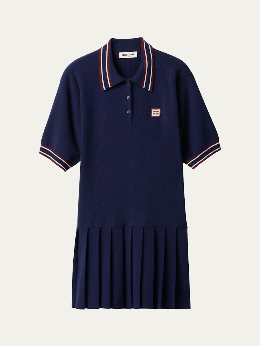 Miu Miu knit polo tennis dress with a tennis skirt features stripe tipping and a logo patch Spread collar; button front Short sleeves Semiraglan shoulder Mini length Shift silhouette Slipover style Cashmere/wool Made in Italy