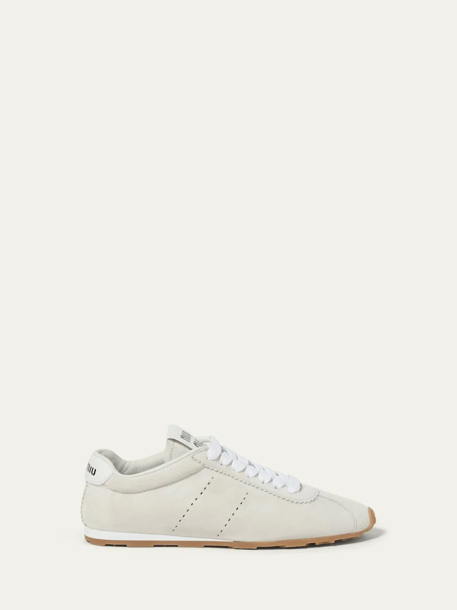 Miu Miu suede retro runner sneakers with contrast leather trim 0.17 in / 5 mm flat heel Round reinforced toe Laceup vamp Logo at tongue and backstay Lining: Leather Rubber outsole Made in Italy