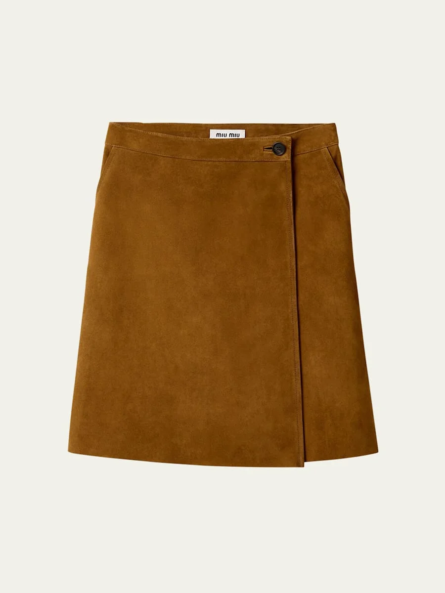 Miu Miu wrap skirt in suede with a logo embroidered back detail Mid waist Angled side slip pockets Knee length Aline silhouette Button side closure Leather Made in Italy