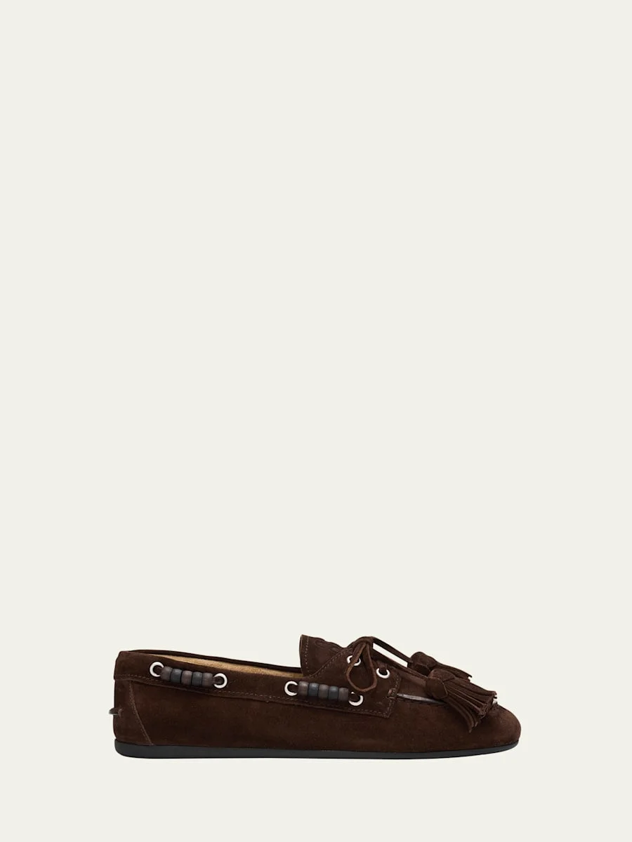 Miu Miu mocassin-style boat loafers in calf suede accented with tonal beading and tassel tie ends 360 lace detailing 0.17 in / 5 mm flat heel Round moc toe Notched vamp with tonal logo lettering Lace-up vamp Slip-on style Rubber outsole Lining: Leather Made in Italy Online Inquiries: BGS21_X6XYZ| Store Inquiries: #5045919