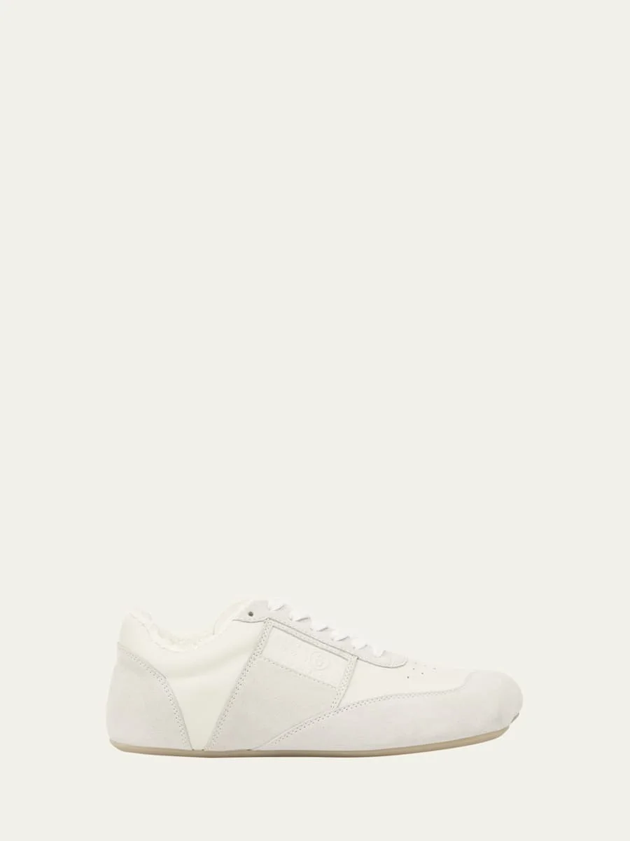 MM6 Maison Margiela low-top sneakers in tonal suede and leather 0.25 in / 10 mm flat heel Anatomic toe Numeric signature at the side Lace-up vamp Signature white stitch at backstay Rubber outsole Lining: Cotton/polyester Spot clean, wipe clean Made in Italy Online Inquiries: BGS21_X6XEW| Store Inquiries: #5036774