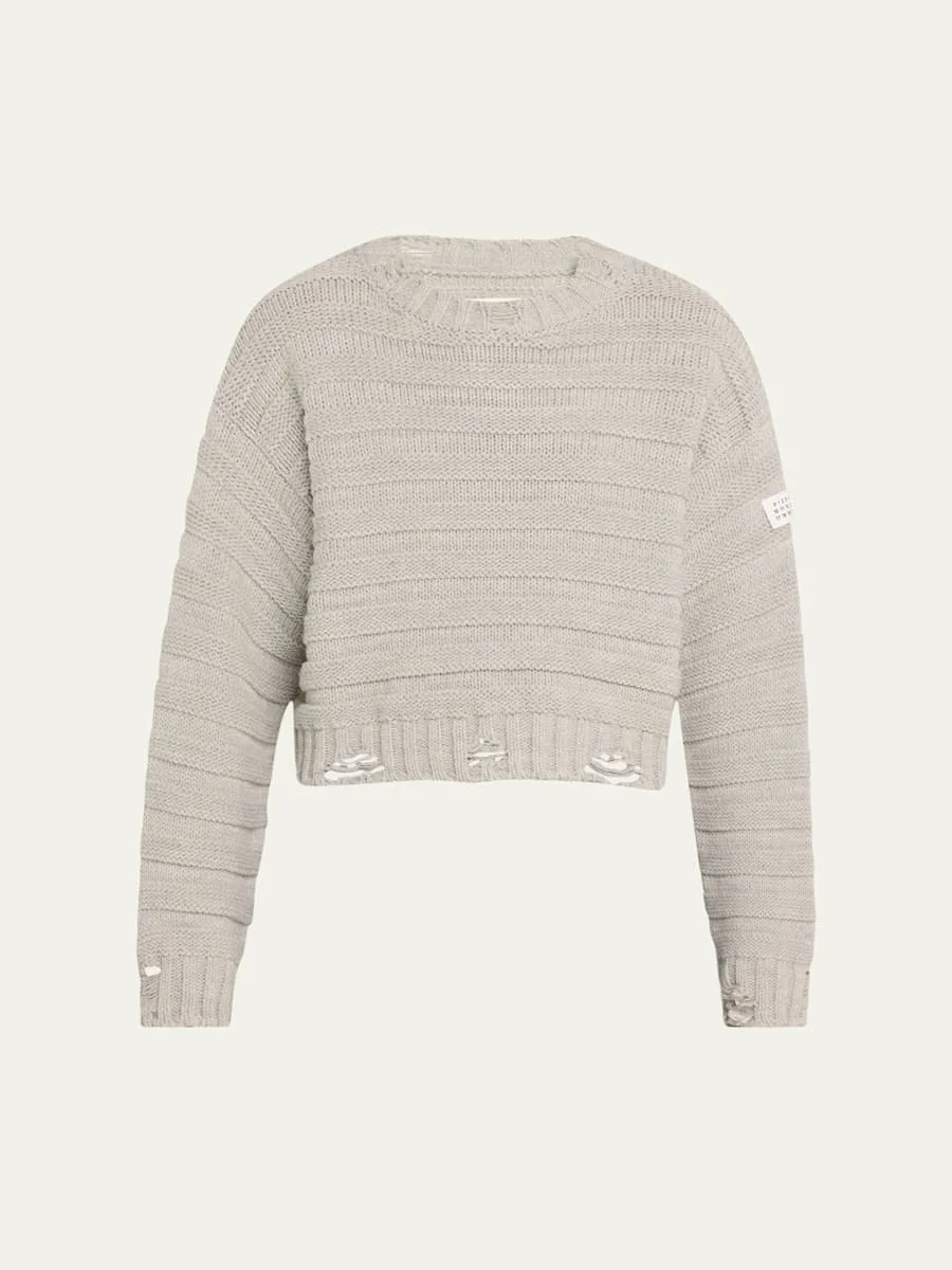MM6 Maison Margiela distressed wool-blend sweater Crew neckline Dropped shoulders Long sleeves Relaxed fit Hem falls to the hip Pullover style Virgin wool/acrylic Unlined Dry clean Imported Online Inquiries: BGS21_T6RQS| Store Inquiries: #5014276