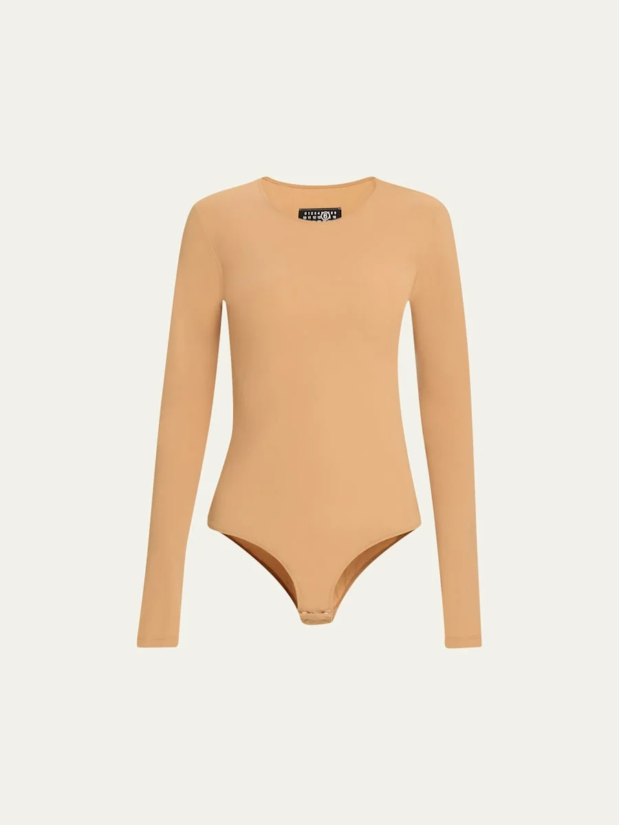 MM6 Maison Margiela stretch-knit bodysuit Round neckline Long sleeves Fitted silhouette Snap-gusset closure Nylon/polyamide/elastane Hand wash Made in Italy Model is 5'10"/177cm. Online Inquiries: BGS21_I2KL2| Store Inquiries: #4745435