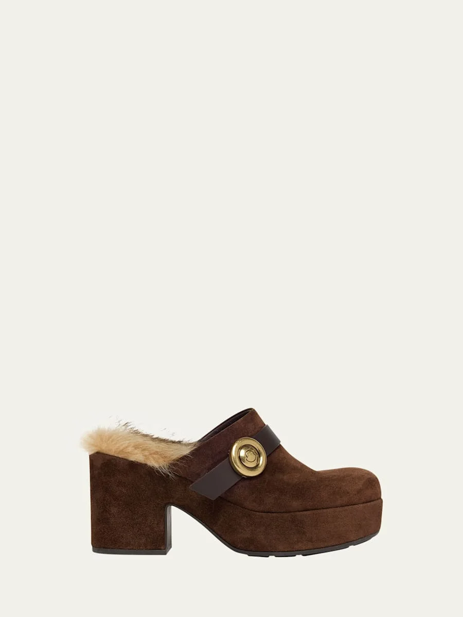Moncler "Amalia" mules in suede with dyed sheep shearling (Italy) with polished bell logo hardware 3.50 in / 90 mm covered block heel Round toe Easy slide style Leather lining Rubber outsole Made in Italy Online Inquiries: BGS21_X6YHR| Store Inquiries: #5057232