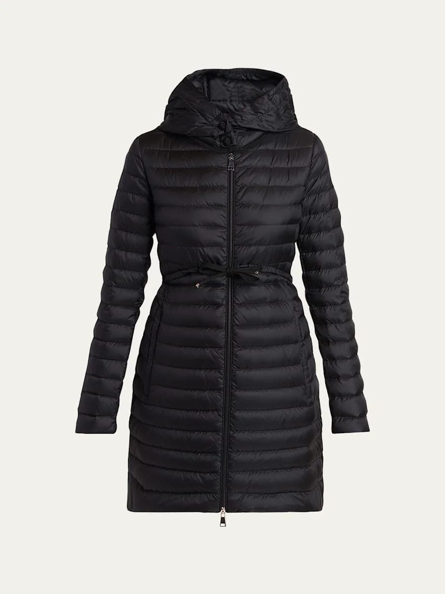 Crafted from nylon leger, the "Barbel" parka by Moncler is insulated with premium down and boasts an adjustable drawstring waist for a personalized fit. Features a signature embroidered logo patch on the left sleeve Hooded neckline with snap closure Long sleeves Side zip pockets Slim fit Midthigh length Twoway zipfront Nylon/polyamide Fill: Down/feather Lining: Nylon/polyamide Machine wash cold Imported