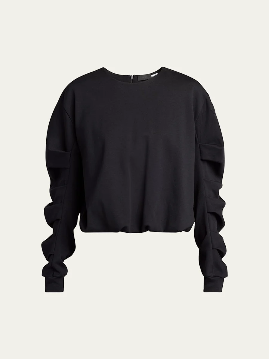 Moncler sweatshirt enhanced with gathered sleeves Crew neckline Slightly dropped shoulders Long sleeves Tonal silicone logo patch Blouson fit Hem sits at the hip Center back zip Cotton Partially lined Machine wash cold Made in Italy