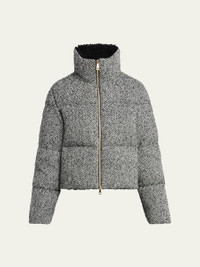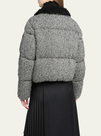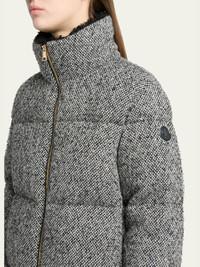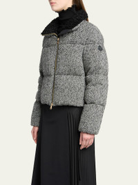 Moncler "Brezesse" wool-blend short jacket enhanced with faux shearling lining and gold-tone hardware Stand collar Long sleeves Features leather logo patch on left sleeve Classic fit Hem sits at the hip Two-way zip-front Wool/nylon/polyamide/lyocell Fill: Down/feather Lining: Nylon/polyester Professional cleaning recommended Imported Online Inquiries: BGS21_T6VS5| Store Inquiries: #5045320