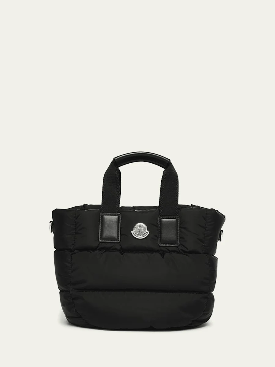 Moncler "Caradoc" quilted micro tote bag in recycled nylon and leather Flat top handles with leather grip Adjustable and detachable crossbody strap Front metal logo plaque Interior, one slip pocket Zip top closure Approx. 6.5"L x 5.1"H x 3.1"D Fill: Down/feather Lining: Acrylic/cotton Professional cleaning recommended Made in Italy