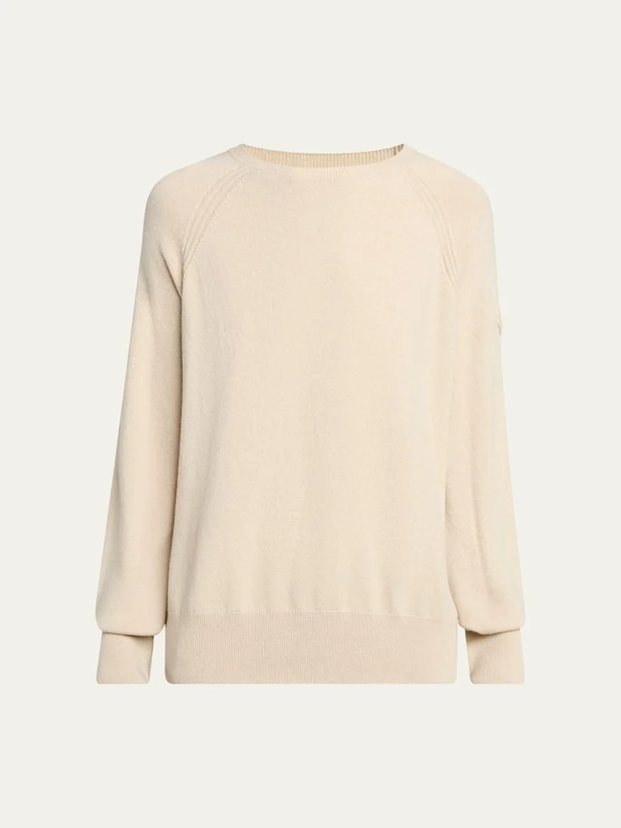 Moncler luxurious cashmere sweater Crew neckline Long raglan sleeves with banded cuffs Logo patch at left sleeve Relaxed fit Banded hem Pullover style Cashmere Professional cleaning recommended Made in Italy