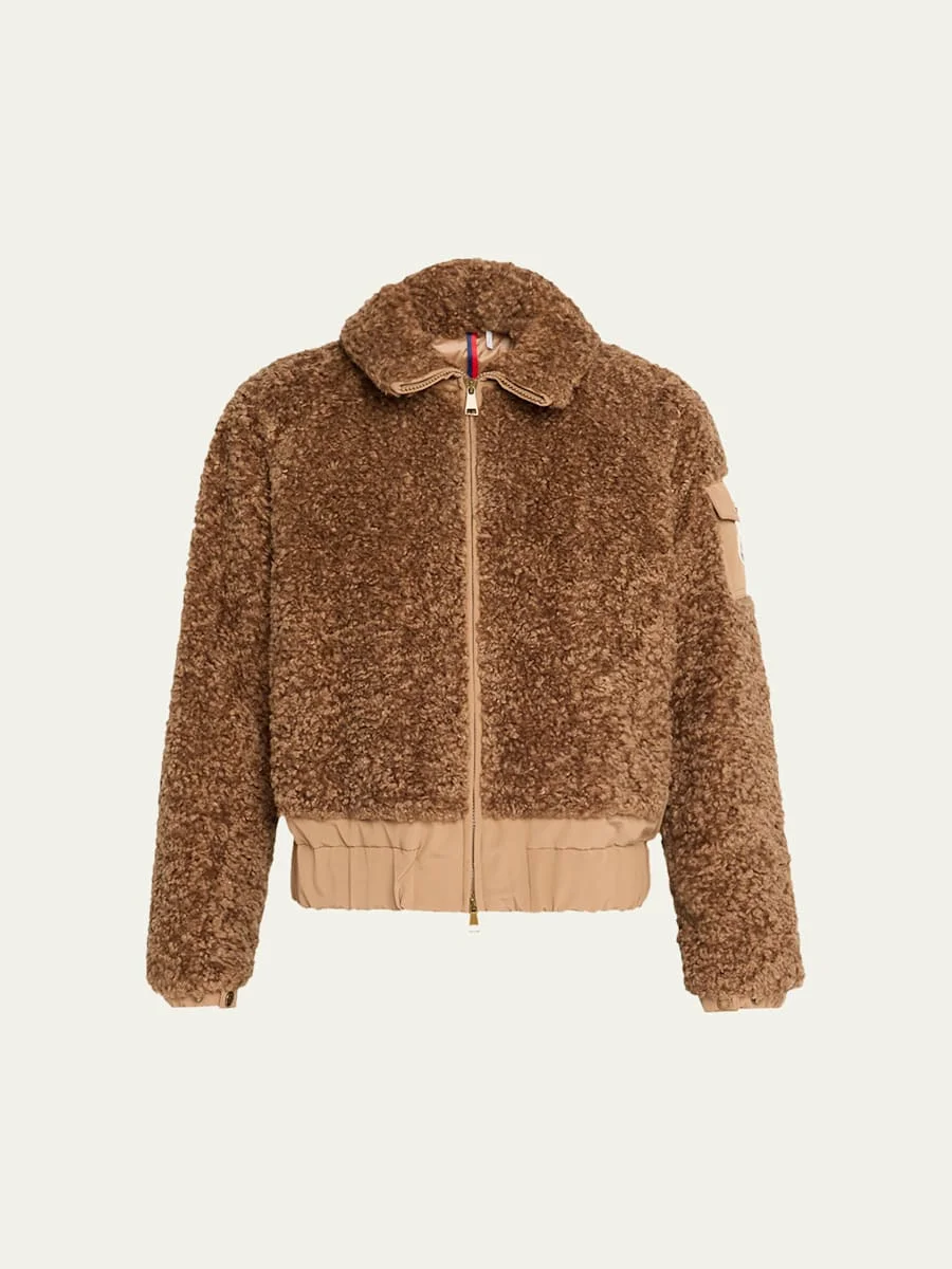 Moncler's "Coligny" teddy jacket is a fresh take on the classic puffer jacket and is elevated with micro cotton trim Stand collar; twoway zipfront Long sleeves with adjustable cuffs Left sleeve pocket with embroidered logo patch Side snap pockets Classic fit Banded hem Polyester/cotton Lining: Nylon Fill: Down/feather Hand wash Imported
