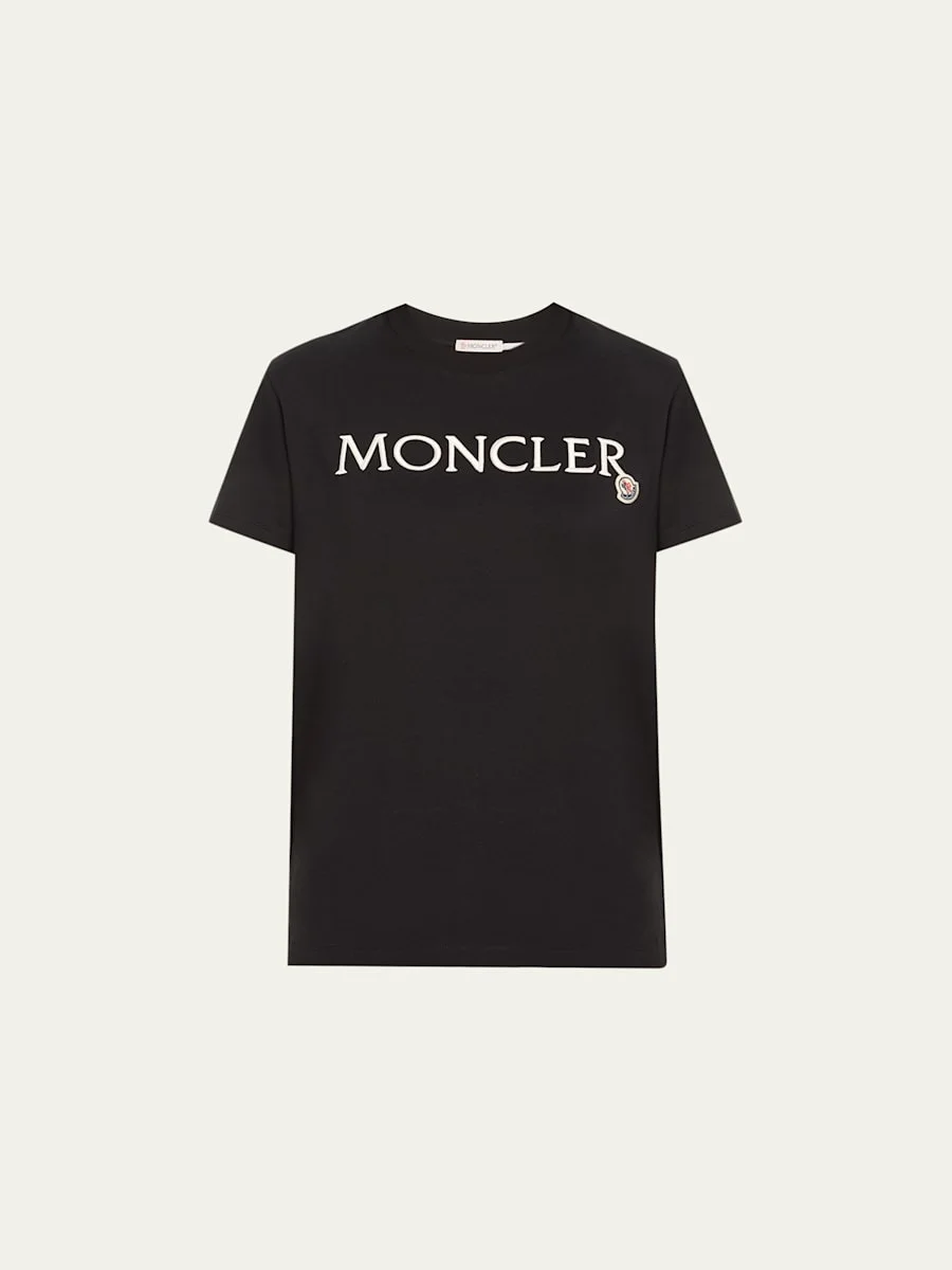 Moncler t-shirt embroidered with chest logo detail Crew neckline Short sleeves Hip length Relaxed fit Pullover style Cotton Unlined Dry clean Imported Model is 5'10"/177cm. Online Inquiries: BGS21_T5ELF| Store Inquiries: #4706469