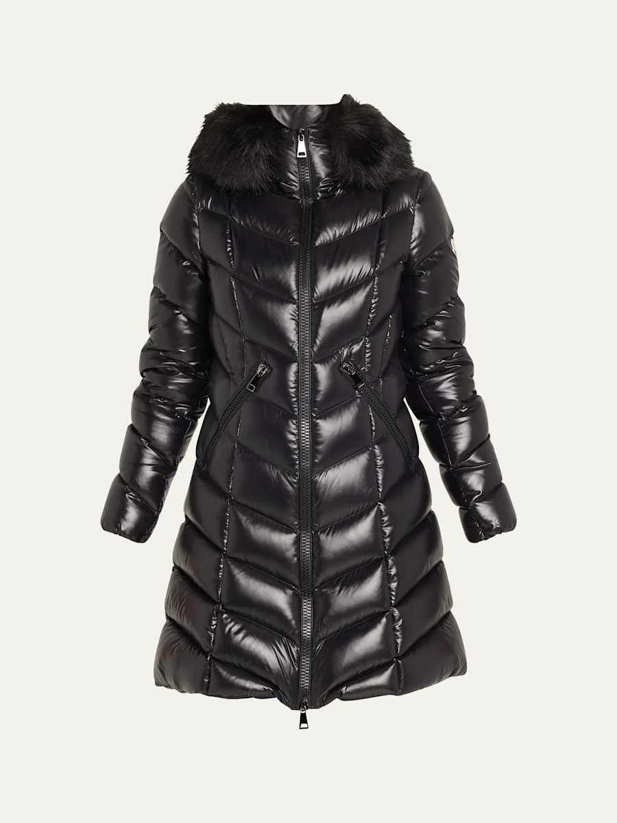Fulmarus Chevron-Quilted Long Puffer Coat with Faux Fur Trim