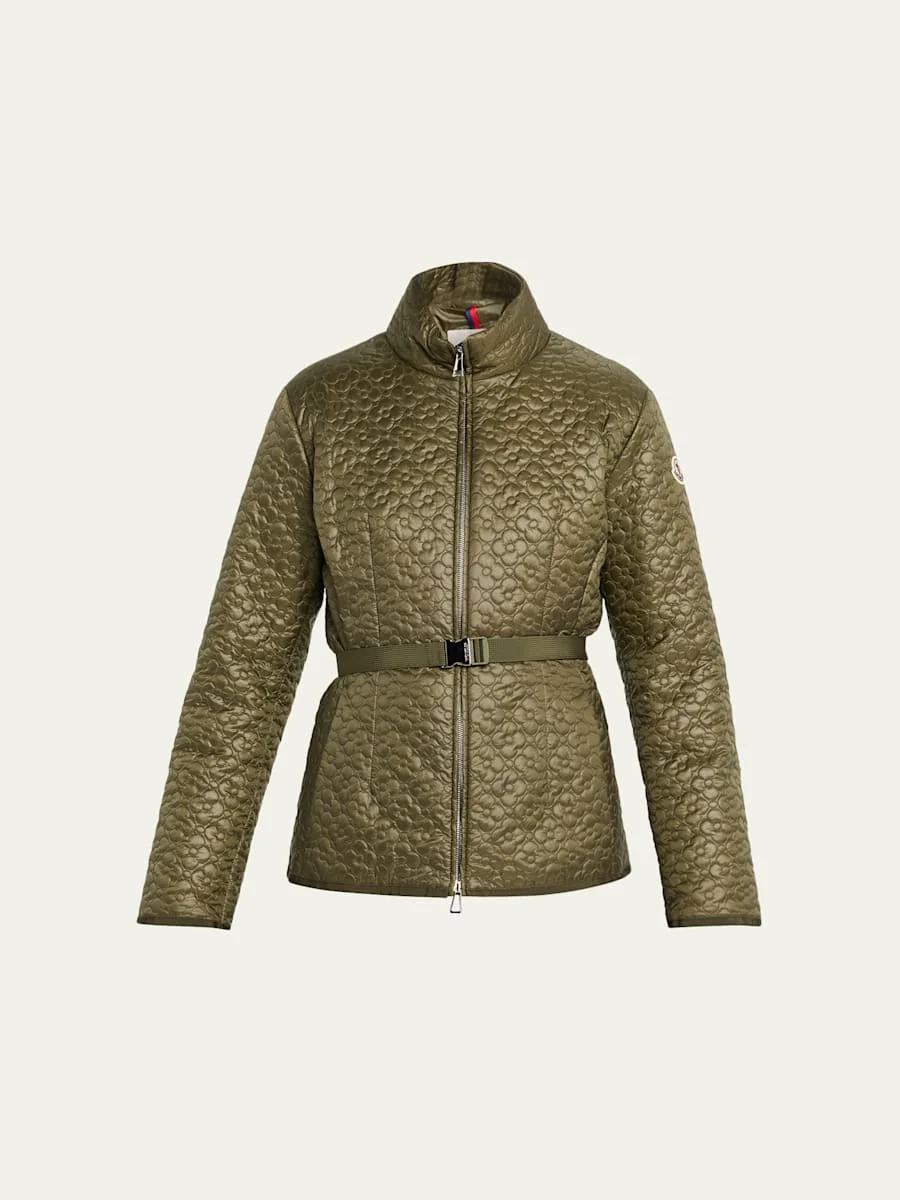 Designed with a floralquilted motif, the "Geranium" jacket by Moncler is crafted from signature longue saison with premium down insulation, fusing supreme warmth with a playful silhouette. Features a signature embroidered logo patch on the left sleeve Stand collar Long sleeves Detachable belt Welt pockets Slim fit Hem sits at the hip Zipfront Polyester/nylon/polyamide Fill: Down/feather Dry clean only Imported SIZE amp; FITModel measurements: 5'10" tall Model is wearing a US size 4/Small