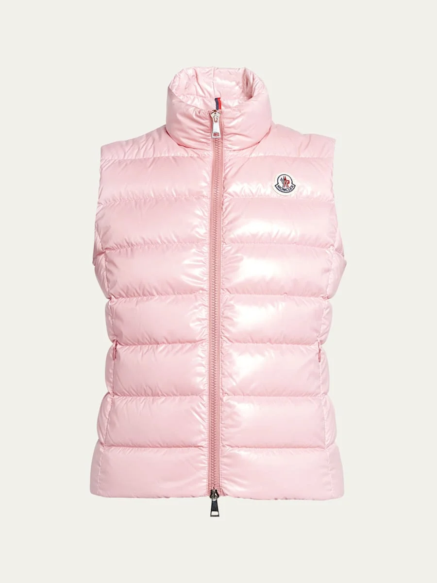 Moncler "Ghany" Crafted from nylon laque, the down vest can be worn as urban outerwear piece during the mid-season or layered under a jacket during colder days. Approx. 23" from shoulder to hem Features signature felt logo on chest. High collar; two-way front zip. Side pockets with concealed zipper. Short length. Slim fit; cut to be slim across the shoulders and to fit closely along the body. Shell and lining: nylon. 90/10 down/feather fill. Care instructions: Wash max 30°C (mild process); Do not bleach; Do not tumble dry; Ironing maximum temperature 110°C (without steam); Dry cleaning in tetrachloroethene or with hydrocarbons (mild process); Professional wet cleaning (mild process); Dry flat; Wash separately. It is advisable to wash and iron the garment in reverse. Made in Moldova. Model is 5'10"/177cmModel is 5'10"/177cm. Size Note: Item runs small, consider ordering a size up. Online Inquiries: BGS21_T5UYL| Store Inquiries: #1540405