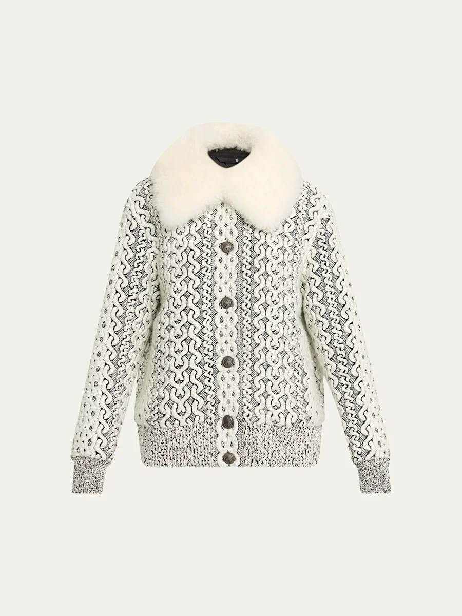Crafted from cableknit jacquard and finished with wool trim, the "Beille" bomber jacket from the Moncler Grenoble Collection boasts a luxurious dyed shearling (Italy) collar that can be removed for versatile styling. Features a signature embroidered logo patch on the left sleeve Dropped shoulders Long sleeves Side zip pockets; inner media pocket Classic fit Snapfront Polyester/wool/nylon/polyamide Fill: Down/feather Dry clean only Made in Italy
