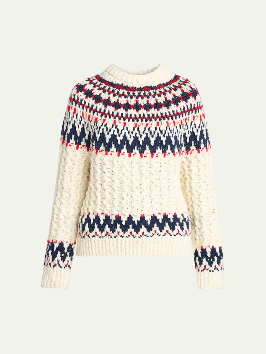 Crafted in a cableknit wool blend, this sweater from the Moncler Grenoble collection boasts a vibrant fairisle motif. Mock neckline Long sleeves Classic fit Hem sits at the hip Pullover style Virgin wool/wool/nylon/polyamide Dry clean Made in Italy