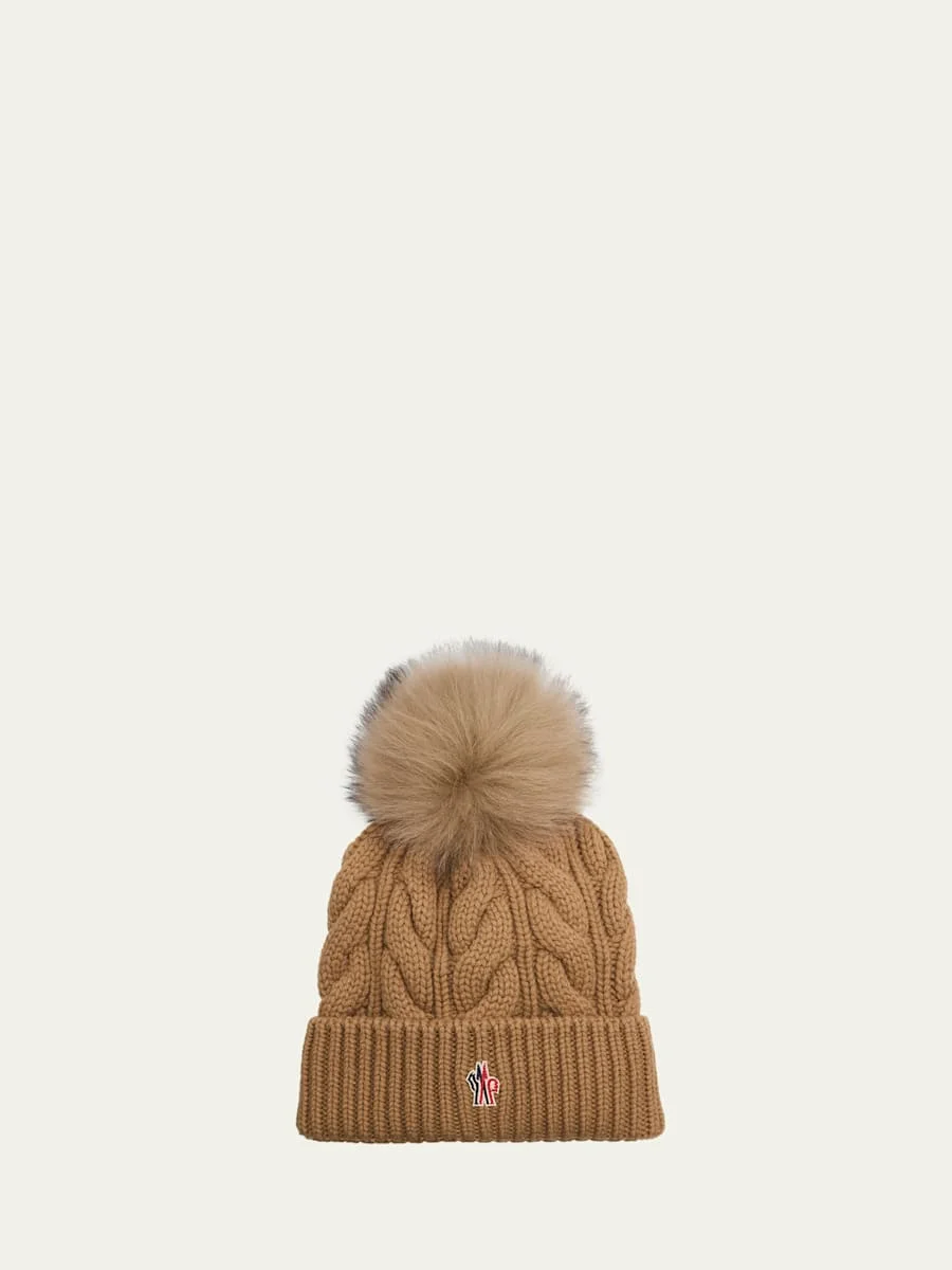 Cable-Knit Wool-Cashmere Beanie with Shearling Pom