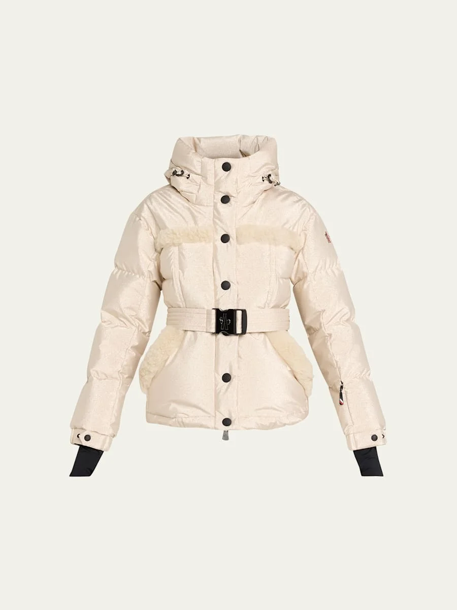 Crafted in metallic performance fabric, the "Mondim" jacket from the Moncler Grenoble collection is insulated with premium goose down and genuine dyed shearling (Romania) trim for an elevated, bold silhouette. Adjustable drawcord hood Long sleeves with adjustable cuffs; stretch jersey wrist gaiters Signature embroidered logo patch on the left sleeve Adjustable, detachable belt with logo buckle and glove carabiner Slip pockets Slim fit Powder skirt Elasticized hem Twoway zipfront with snap storm placket Nylon/polyamide/elastane/metallic fibers Fill: Down/feather Trim: Shearling/fur Professional cleaning recommended Imported