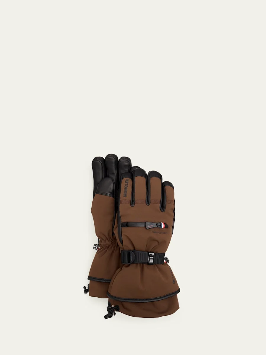Crafted from fourway stretch technical fabric, these padded gloves from the Moncler Grenoble collection feature leather accents on the palms and fingers for easy grip. Features signature logo lettering and patch Adjustable buckle cuffs Zip heatingpad pocket Drawcord wrist closure Leather/polyester/cotton Fill: Polyester Lining: Nylon Imported