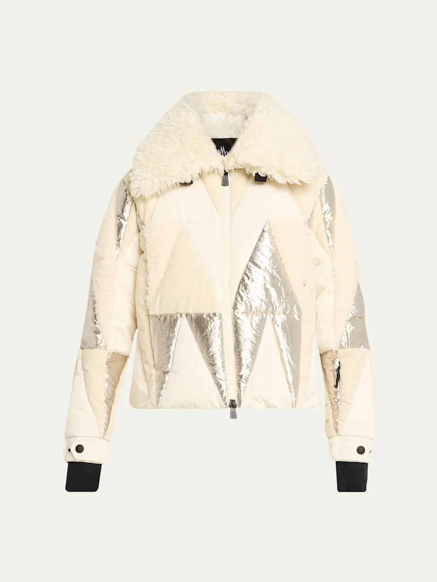 Fusing style and supreme warmth, the "Pamiers" bomber jacket from the Moncler Grenoble Collection features intricate metallic, matte, and teddy fleece patchwork finished with premium down insulation for on and off slope comfort. Signature embroidered logo patch on the left sleeve Wide collar Long sleeves with technical jersey wrist gaiters; adjustable cuffs and ski pass pocket Side pockets with YKK® AcquaGuard® highly water resistant zips; inner media pocket Classic fit Adjustable drawstring hem Powder skirt Twoway zipfront Polyester/wool/nylon/polyamide Fill: Down/feather Dry clean only Imported