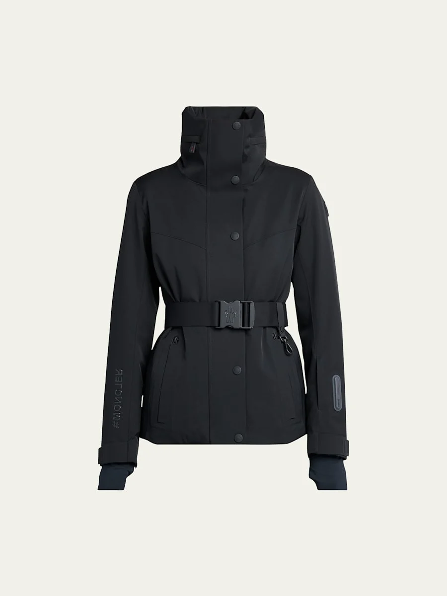Moncler "Hainet" belted snow jacket features a packable hood in the collar Stand collar Two-way front zip; snap placket cover Long sleeves; thumbhole cuffs Signature logo patch at left Removable belt at waist Side zip pockets Mid-length Relaxed fit Nylon/polyamide/elastane Lining: Polyester Dry clean Made in Romania Model is 5'10"/177cm. Online Inquiries: BGS21_T543M| Store Inquiries: #4629575
