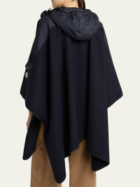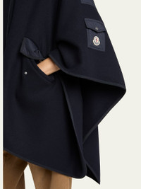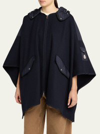 Moncler felted cape finished with signature nylon detailing Signature embroidered logo patch on the left sleeve Adjustable hood Cape sleeves; left sleeve patch pocket Angled flap pockets Relaxed fit Handkerchief hem Twoway zipfront Cotton Dry clean Imported
