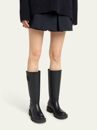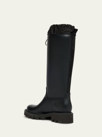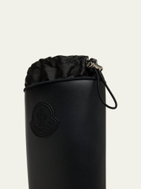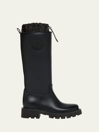 Moncler "Kickstream" tall leather rain boots with nylon trim Embossed logo at side 1.50 in / 40 mm block heel Round toe Drawstring pull at collar Rubber outsole Lining: Leather Made in Italy Online Inquiries: BGS21_X7FX0| Store Inquiries: #4841903