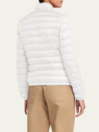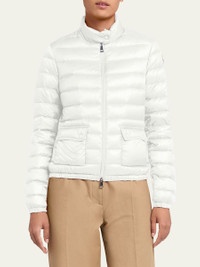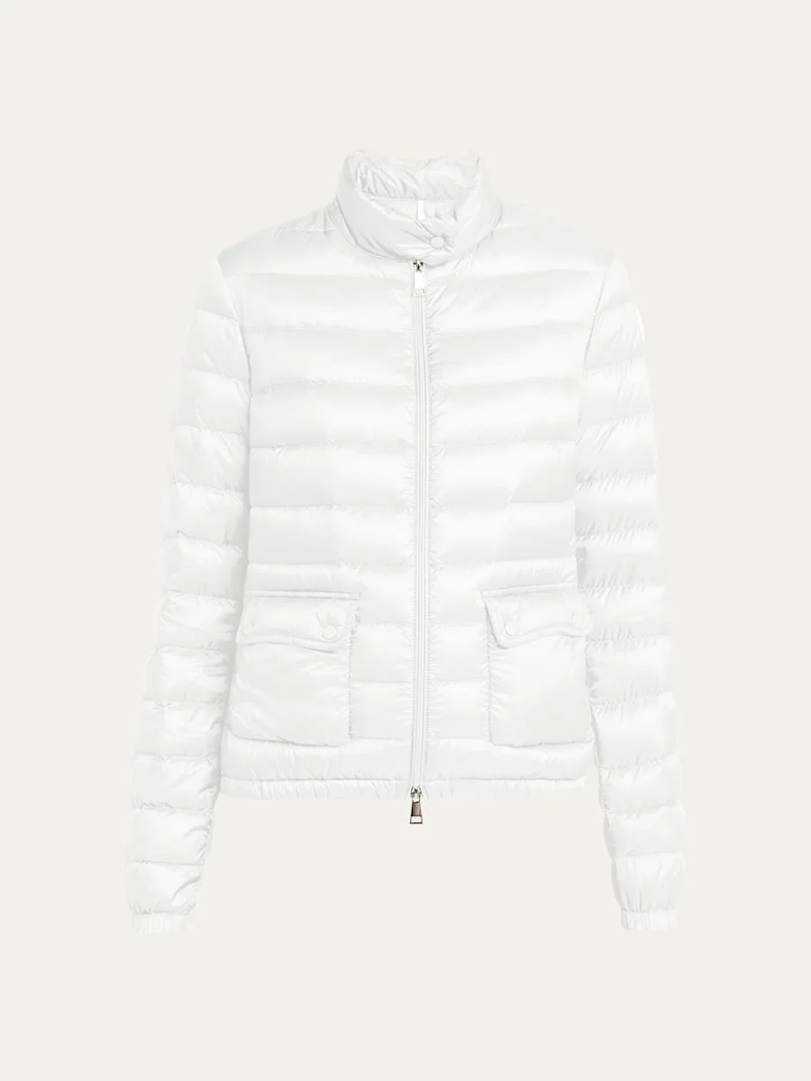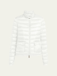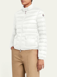 Moncler "Lans" lightweight quilted puffer jacket Stand collar with snaps Long sleeves with elastic cuffs Embroidered logo patch at left sleeve Flap pockets Classic fit Hem sits at the hip Twoway zipfront Nylon/polyamide Fill: Down/feather Lining: Nylon Hand wash Imported