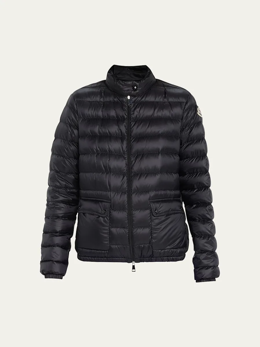 Moncler "Lans" puffer jacket with a classic paneled stitch Band collar; snap closure Twoway front zip Long sleeves; logo patch at left Front patch pockets Hip length Relaxed fit Nylon Lining: Nylon Fill: Feather/down Dry clean Imported