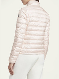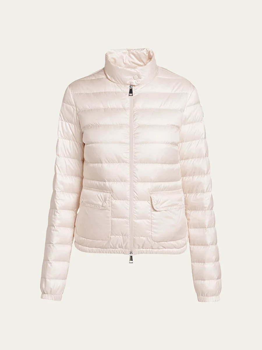 Moncler "Lans" puffer jacket with a classic paneled stitch Band collar; snap closure Twoway front zip Long sleeves; logo patch at left Front patch pockets Hip length Relaxed fit Nylon Lining: Nylon Fill: Feather/down Dry clean Imported