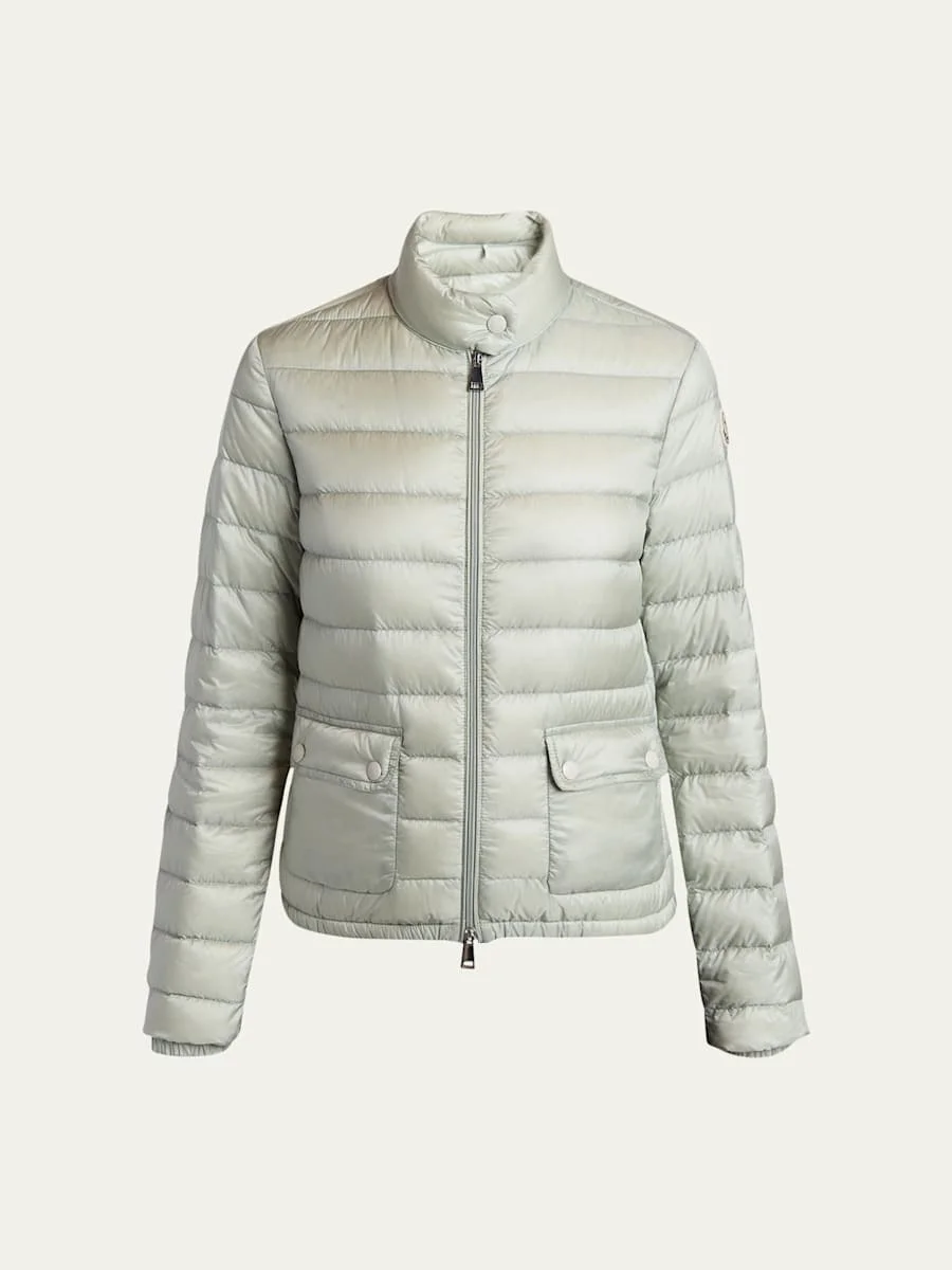 Crafted from signature nylon laque, the "Lans" jacket by Moncler is adorned with tonal hardware and premium down insulation for a seamless, warm silhouette. Features signature embroidered logo patch on the left sleeve Stand collar; snap closure Long sleeves with elastic cuffs Flap pockets Classic fit Hem sits at the hip Twoway zipfront Nylon/polyamide Fill: Down/feather Lining: Polyester Hand wash Imported