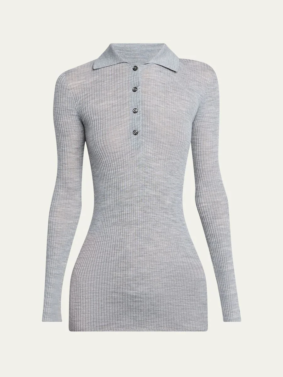 Moncler ribbed polo top in superfine virgin wool Point collar; button-placket Long sleeves Fitted Hem falls to the hip Pullover style Virgin wool Dry clean Made in Italy Online Inquiries: BGS21_T6WGQ| Store Inquiries: #5051087