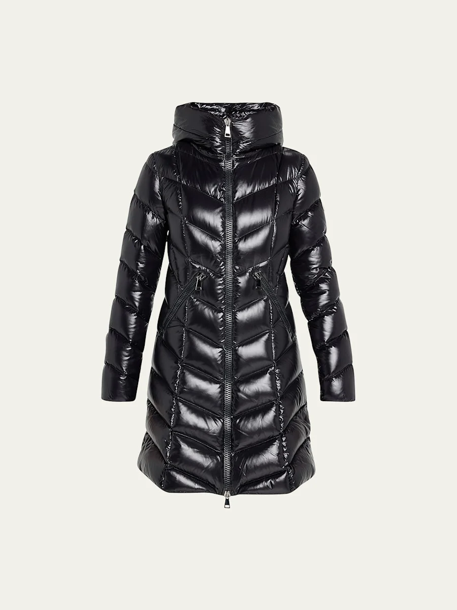 Moncler "Marus" long puffer coat with a chevron panel styling and a shiny finish Hooded collar Two-way zip front Long sleeves; logo patch at left Side zip pockets Knee length Relaxed fit Polyamide Lining: Nylon Feather/down fill Dry clean Imported Model is 5'10"/177cm. Online Inquiries: BGS21_T3Z4P| Store Inquiries: #4382351