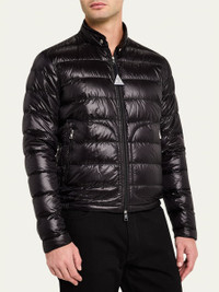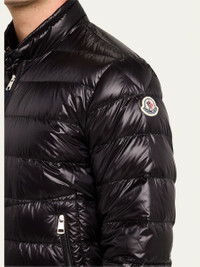 Moncler "Acorus" down puffer jacket features a signature logo patch at the sleeve Stand collar Front zip closure Long sleeves Side zip pockets Regular fit Lining: Nylon Machine wash cold Imported