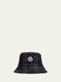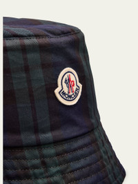Moncler "Archivio" bucket hat crafted from a premium wool-blend, featuring a classic Black Watch plaid pattern for a refined interpretation on a casual staple Embroidered logo emblem on the front Flat crown Downturn brim Virgin wool/polyester/leather Made in Italy Online Inquiries: BGS21_NDHHJ| Store Inquiries: #5040084